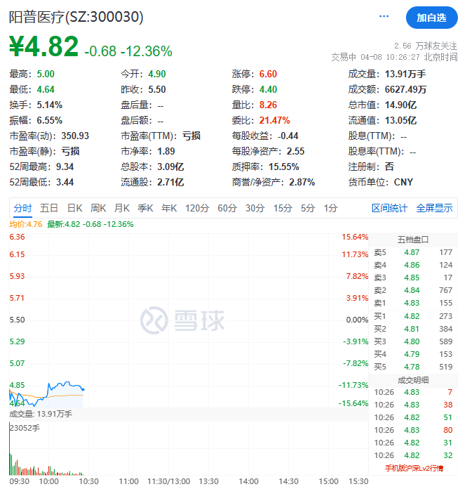 睿创微纳昨日也公布了重大事项:其于4月4日收到国家监察委员会签发的《留置通知书》和《立案通知书》,对公司实际控制人、董事长兼总经理马宏实施留置。据悉,马宏还是睿创微纳的核心技术人员之一,是该公司的研发带头人,负责公司技术、产品和平台的战略规划及组织管理。 另外,上午阳普医疗盘中跌超15%,股价最低至4.64元/股。