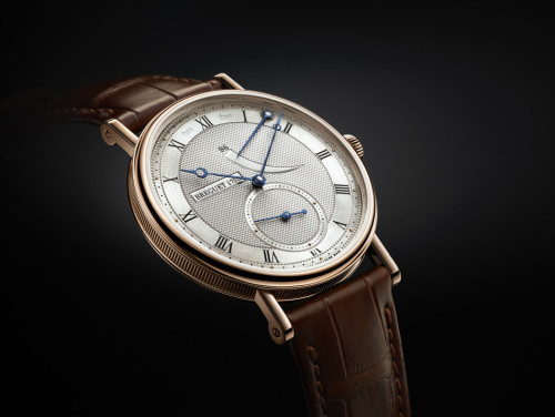 如今宝玑针已经成了宝玑腕表的重要特征之一,甚至这一元素已经融入了宝玑的LOGO设计,而这款腕表有特色的指针还不止主体的小三针,还有介于一点位和两点位之间的动力指示针。