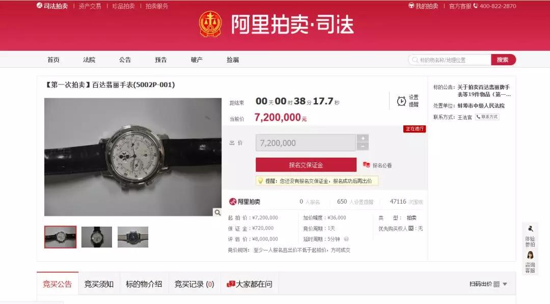 来源:新安晚报微信公号 这两天,安徽省蚌埠市中级人民法院正在阿里拍卖上拍卖安徽省司法厅原副厅长程瀚的受贿所得物,共19件,包括手表、戒指、玉器、项链、金条等。记者注意到,拍卖的19件标的物中,手表共有6块,其中百达翡丽牌手表2块,最贵的百达翡丽手表(5002P-001)起拍价为720万元。
